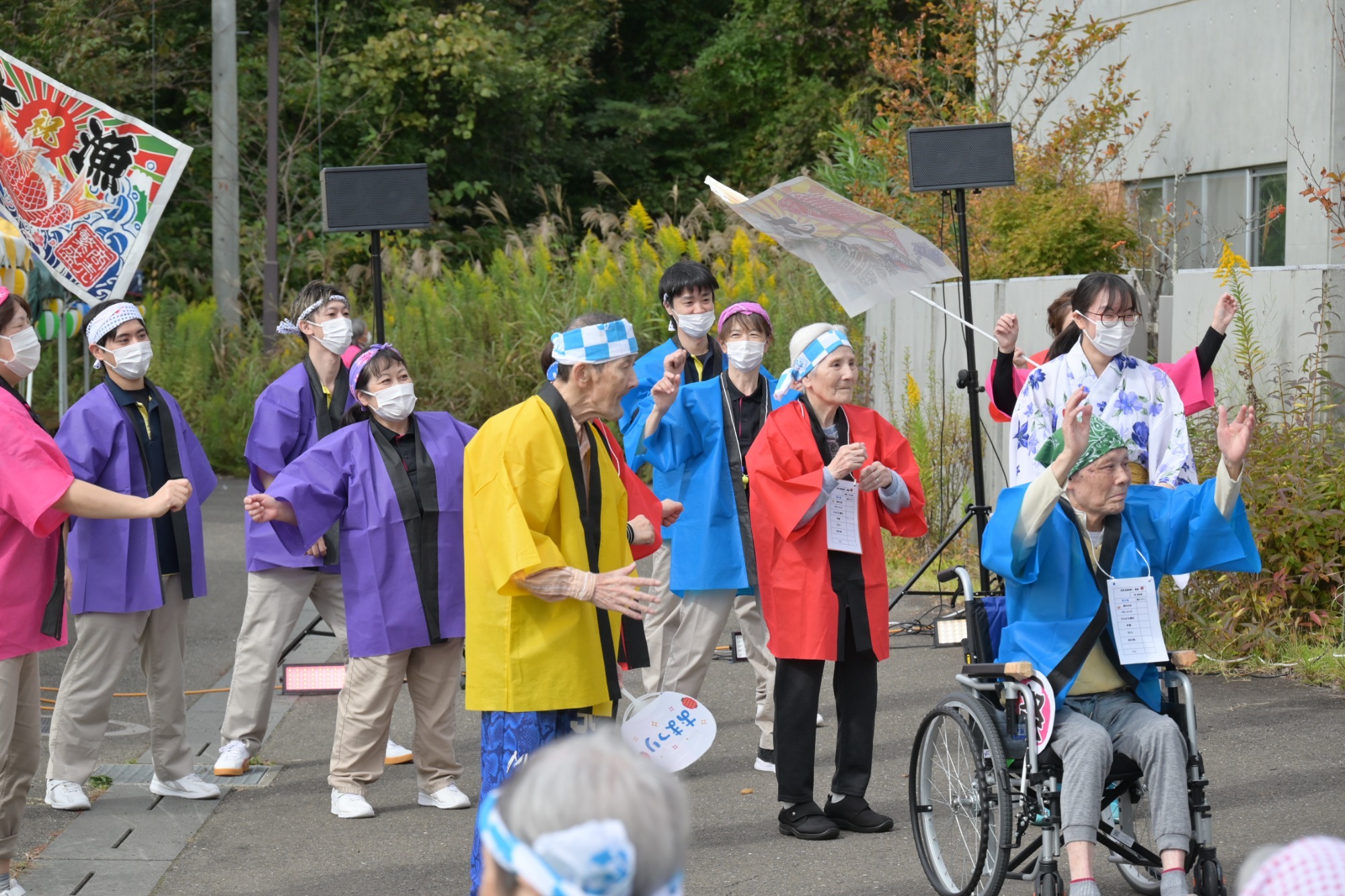 2日目は晴天に恵まれ外での開催になりました。職員とご利用者様のソーラン節やカラオケ大会などに